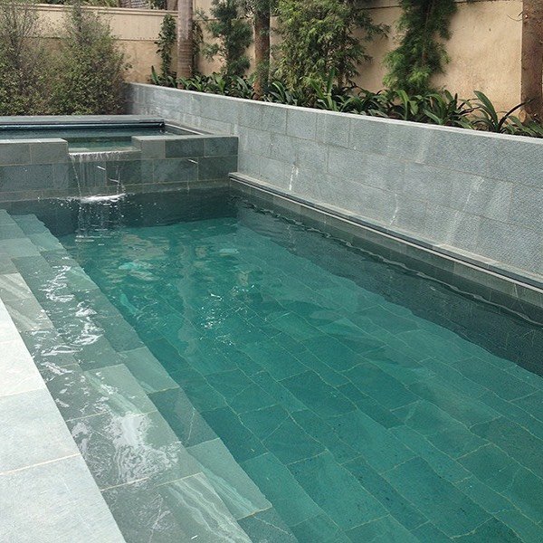 Sen kirjava vihreä sävy harmonisoituu täydellisesti ympäröivien mäntymetsien kanssa, tehden siitä suositun valinnan ulkouima-altaiden ympärille. Hiekkapuhallettu tai harjattu pinta takaa turvallisuuden alueilla, joissa tarvitaan lisäpitoa, kuten altaan portailla.