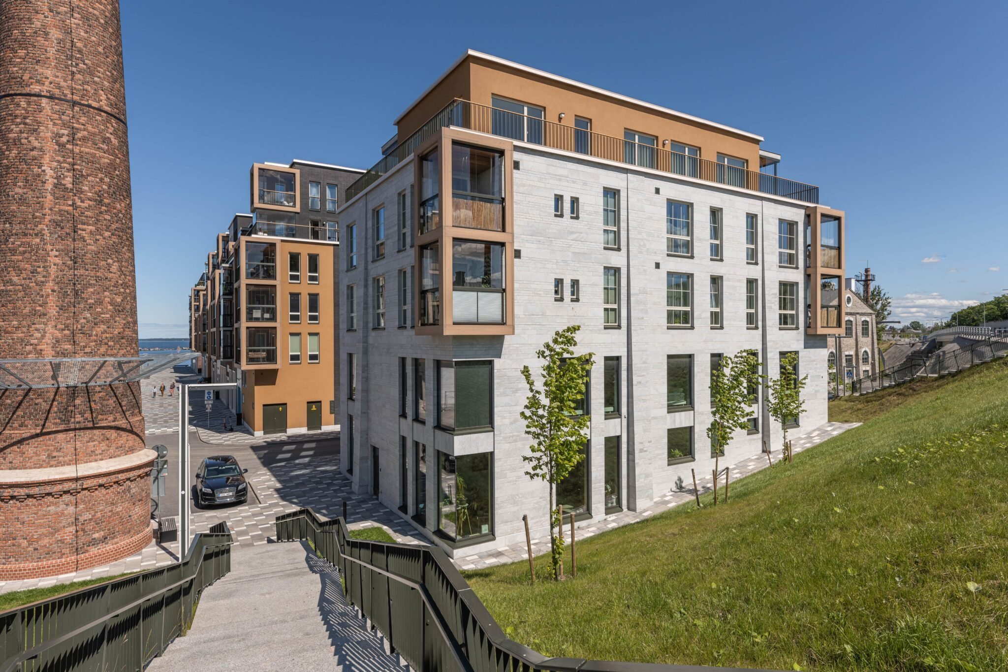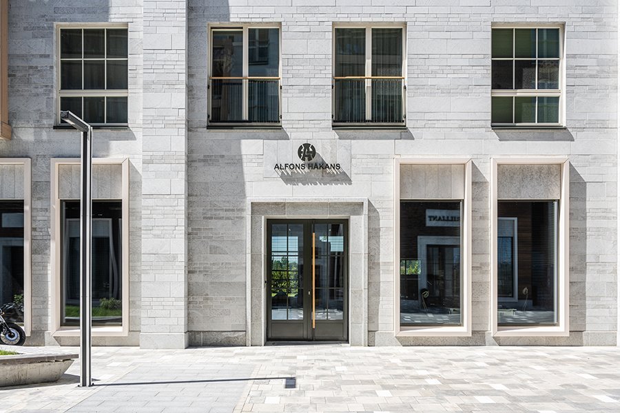 Arensburg Limestone with a sawn surface finish has the effect of light grey bricks when used externally as façade panels. One of the great properties of Arensburg Limestone is its resistance to repeated cycles of freezing and thawing, indeed it is one of the very few limestones that can be used externally in the Nordic climate.